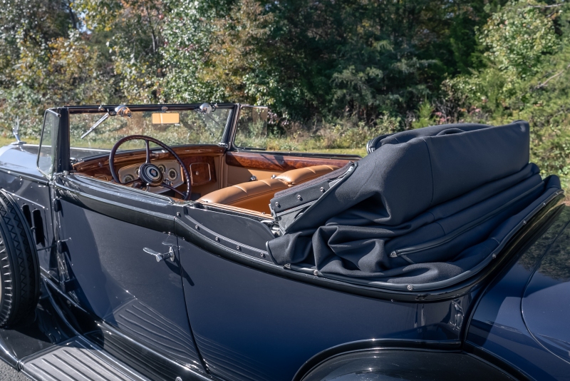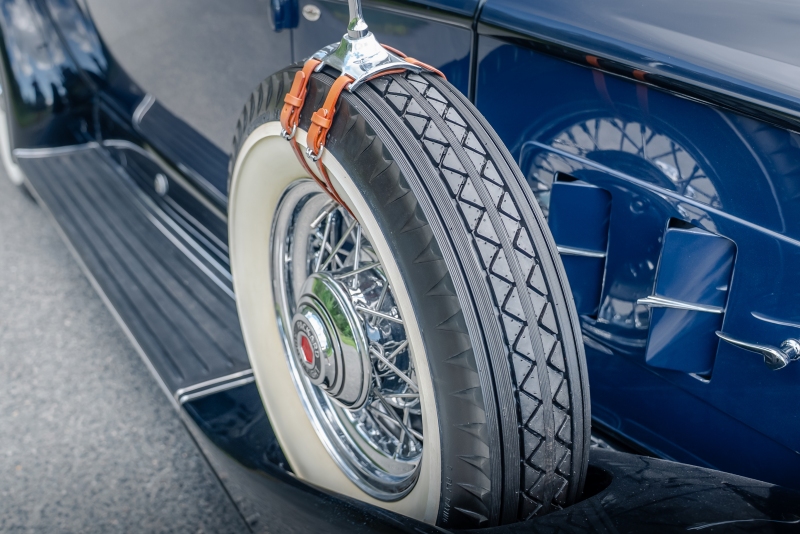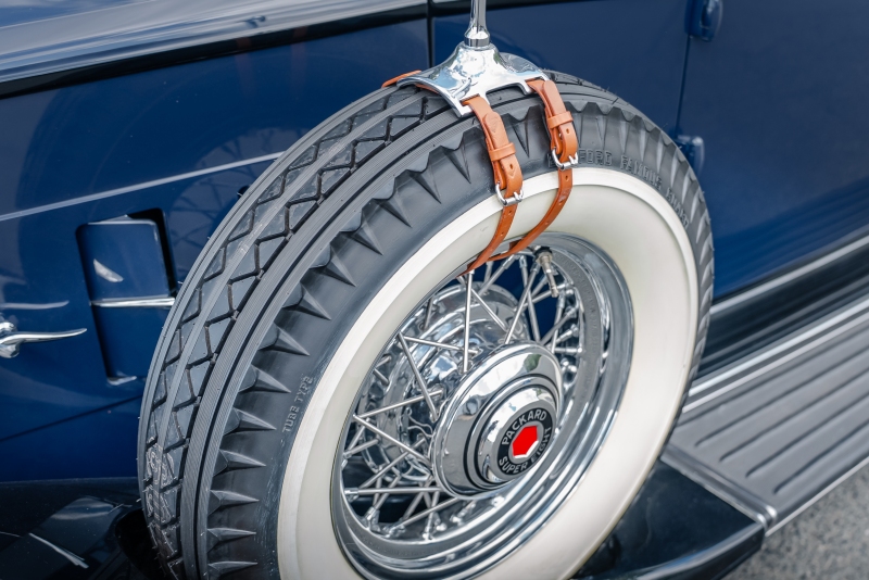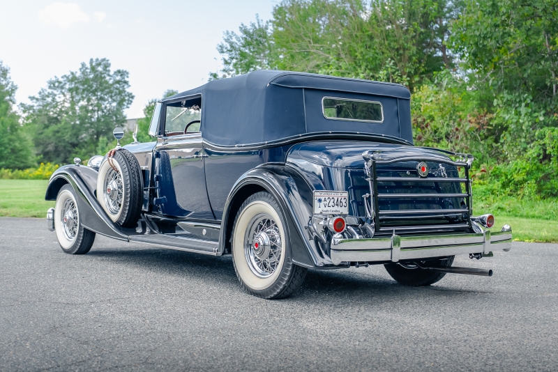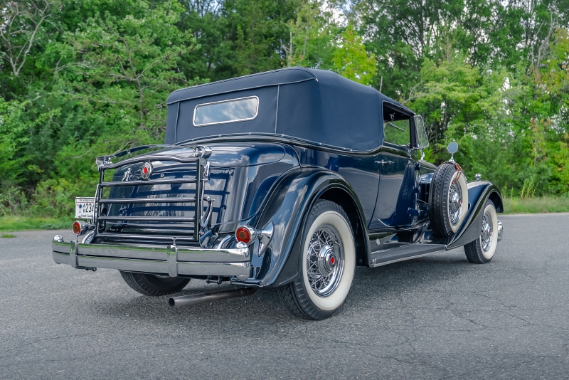 Elegant accessories complete the presentation: dual side-mounted spares with mirrors, wide whitewall tires, immaculate folding luggage rack and correct Trippe driving lamps. The convertible top folds with precision, revealing a finely detailed cockpit that embodies Packard’s proud slogan — “Ask the man who owns one.”