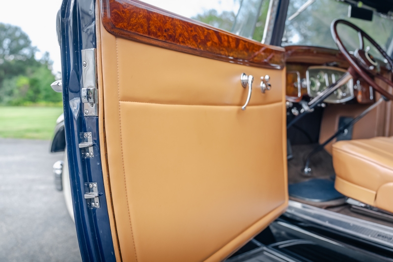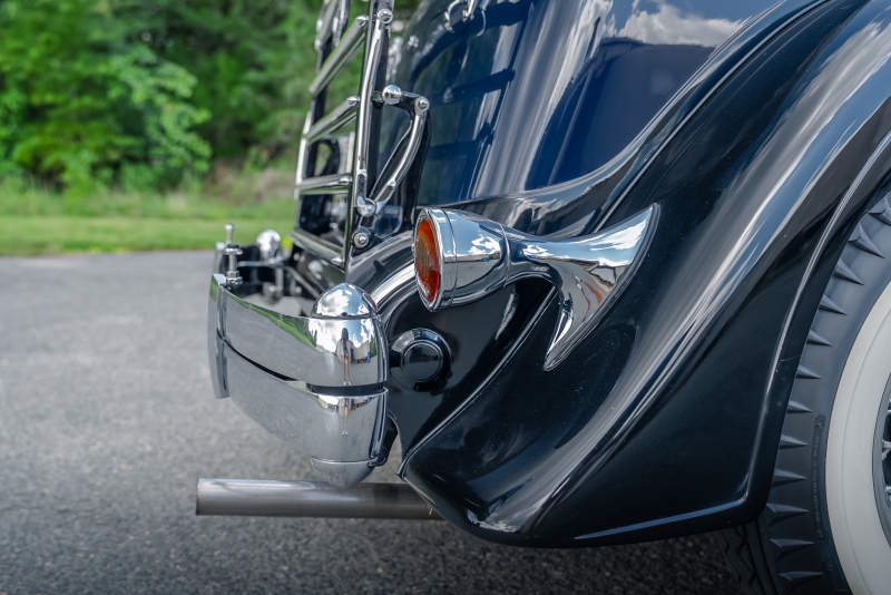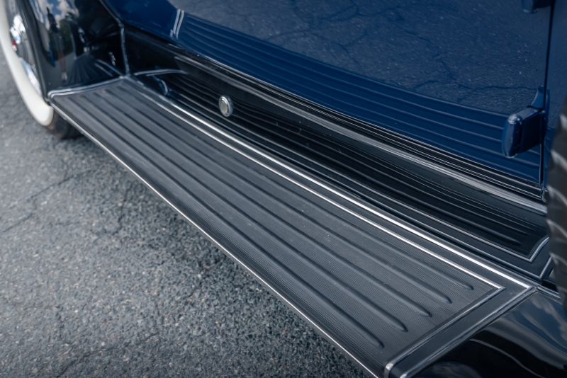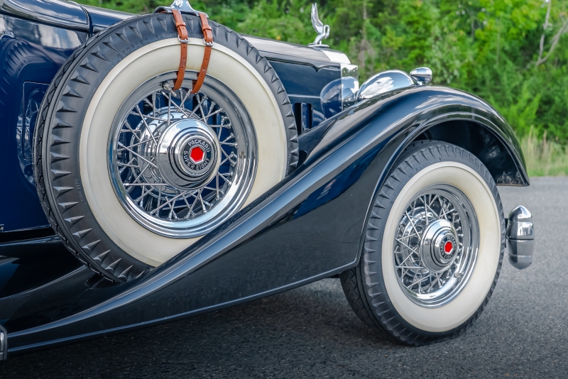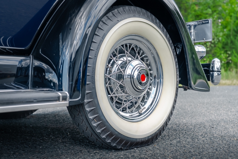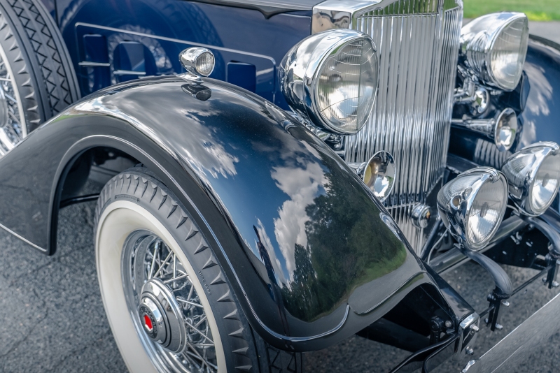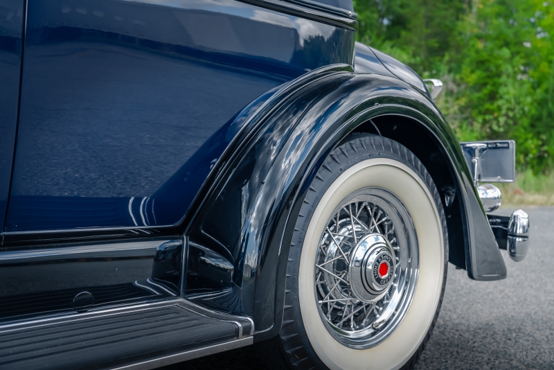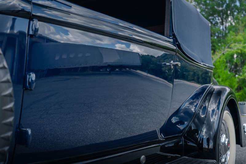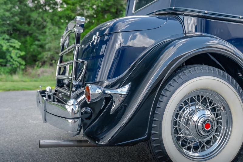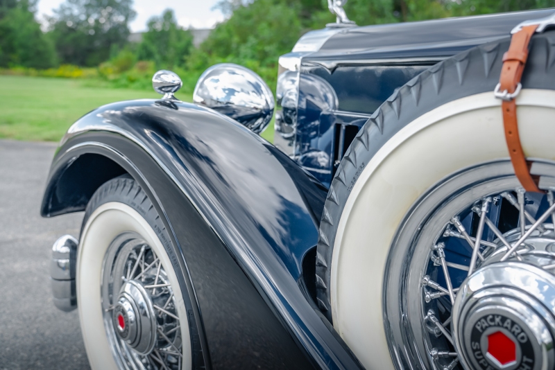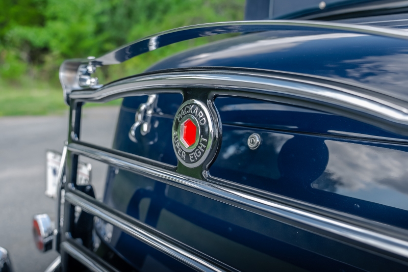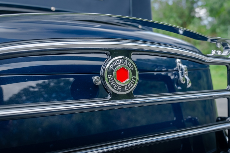 This example has been the subject of a meticulous, frame-off restoration performed to a high concours standard, returning the car to its original splendor. Every detail — from the correct Packard Navy and Black finish to the exquisite chrome brightwork, proper instruments, and luxurious leather and perfect burl faux wood interior — reflects deep respect for authenticity and craftsmanship.