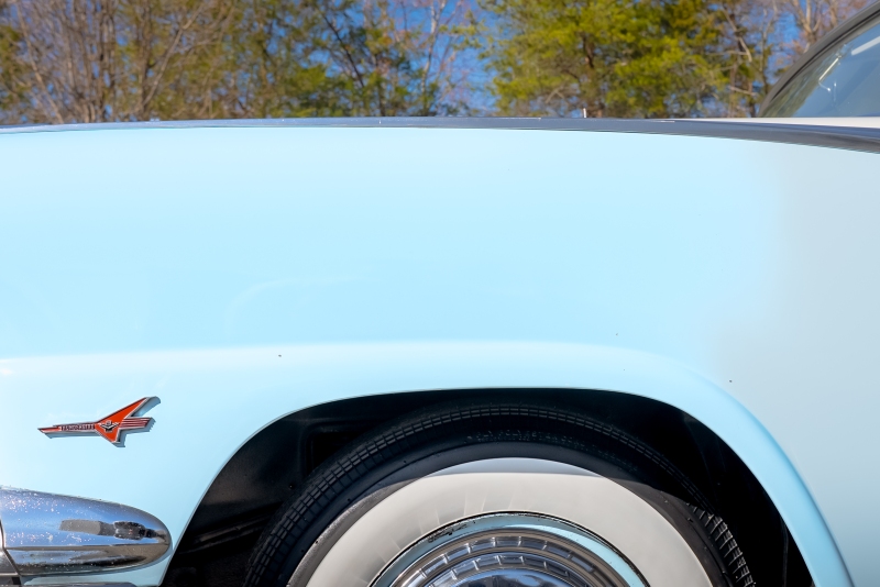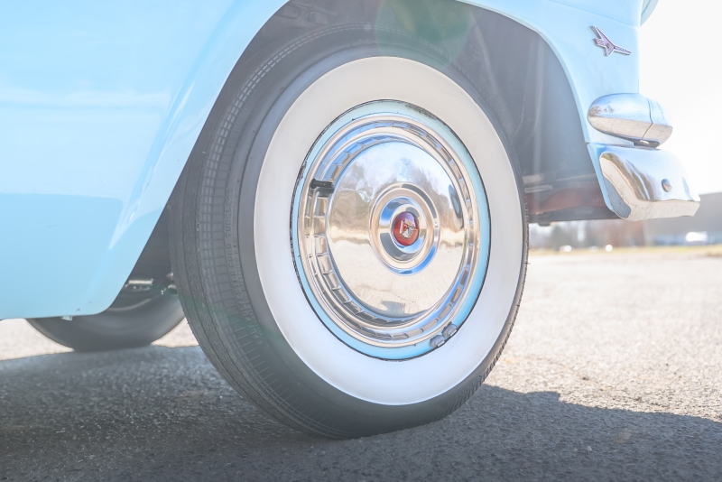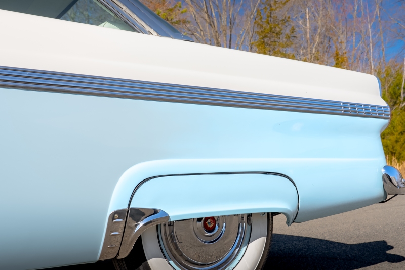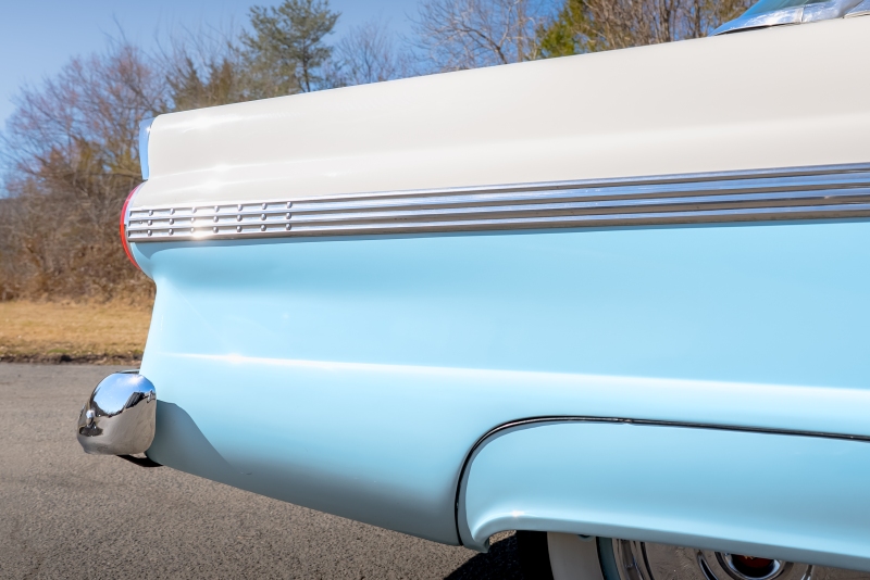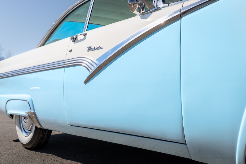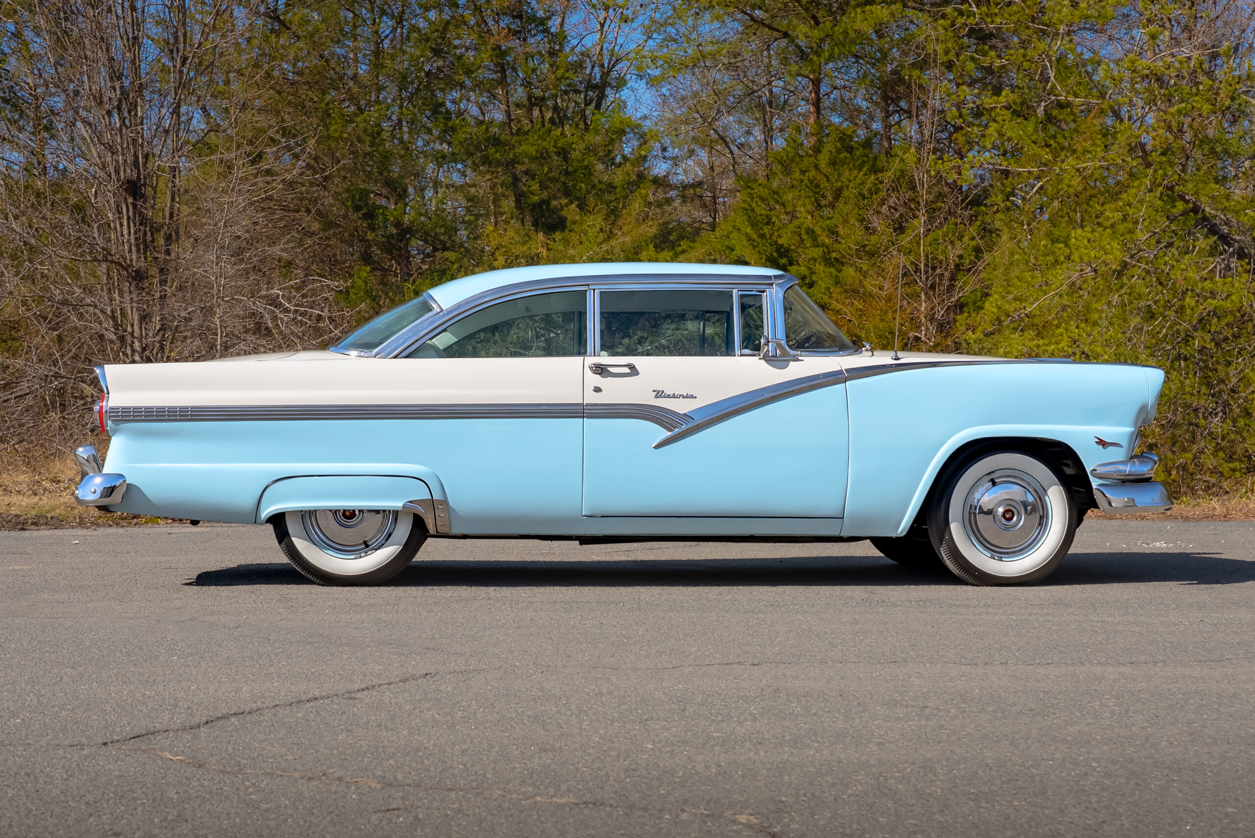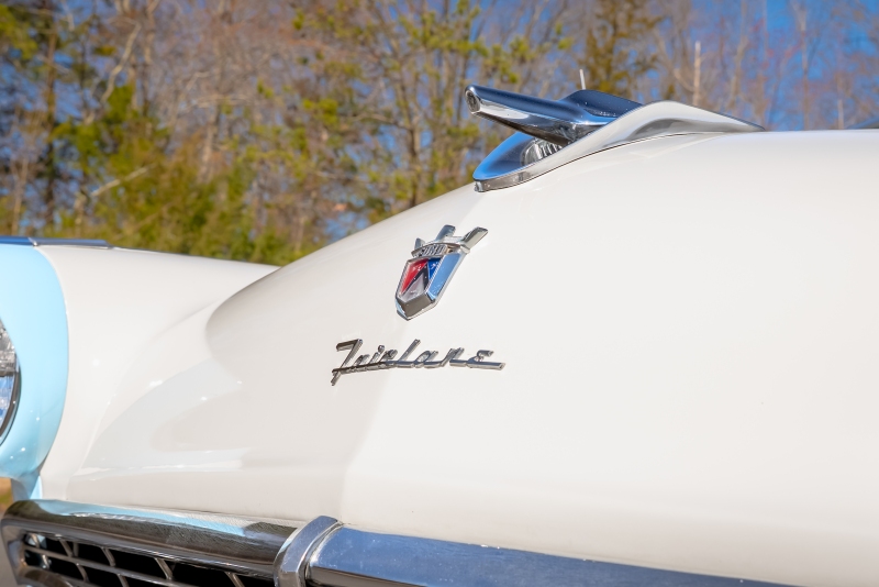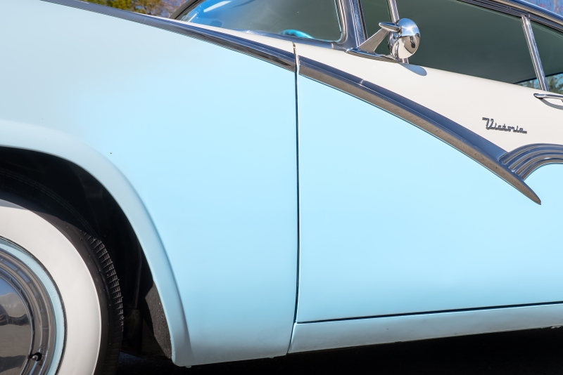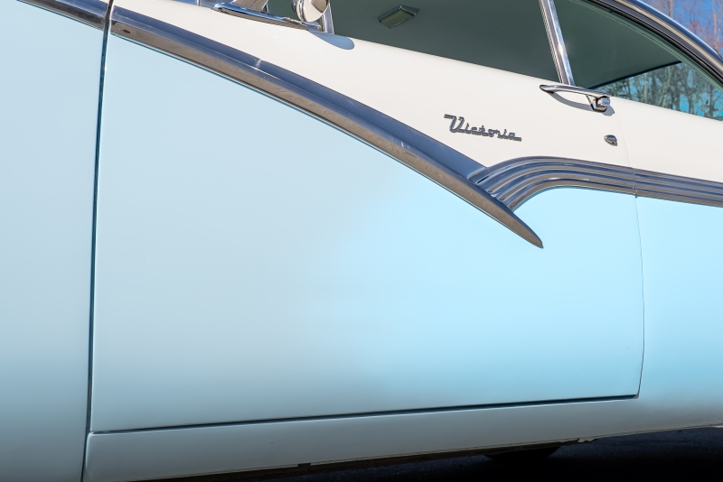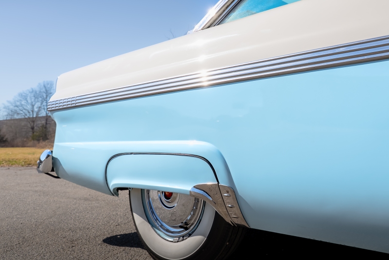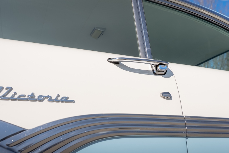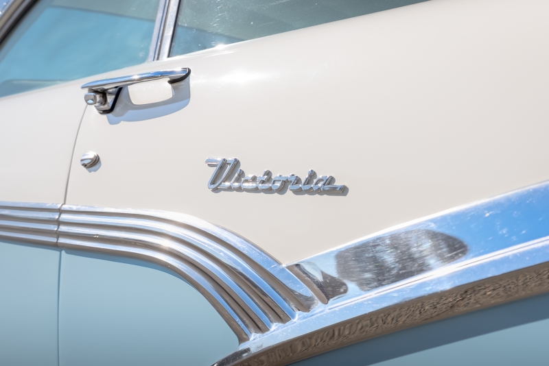 This example is presented in an attractive white over blue two-tone finish, a classic color combination that perfectly complements the car’s elegant lines. The paint is in very good condition, giving the car a bright, well-kept appearance that draws attention wherever it goes. Completing the period look are wide whitewall tires and fender skirts, both signature touches that enhance the Victoria’s unmistakable 1950s character.