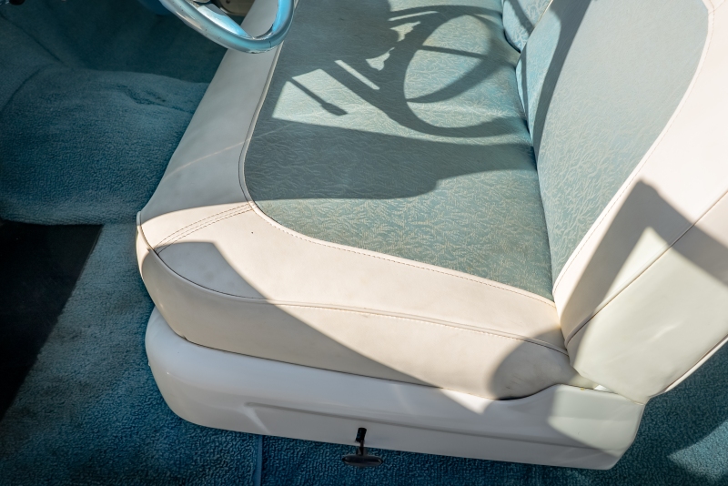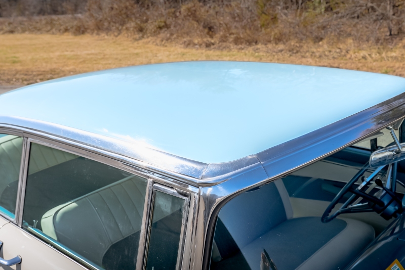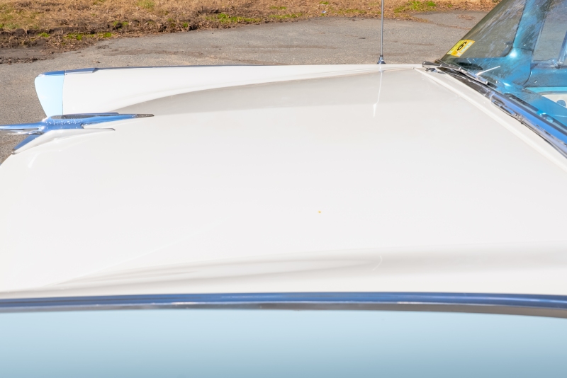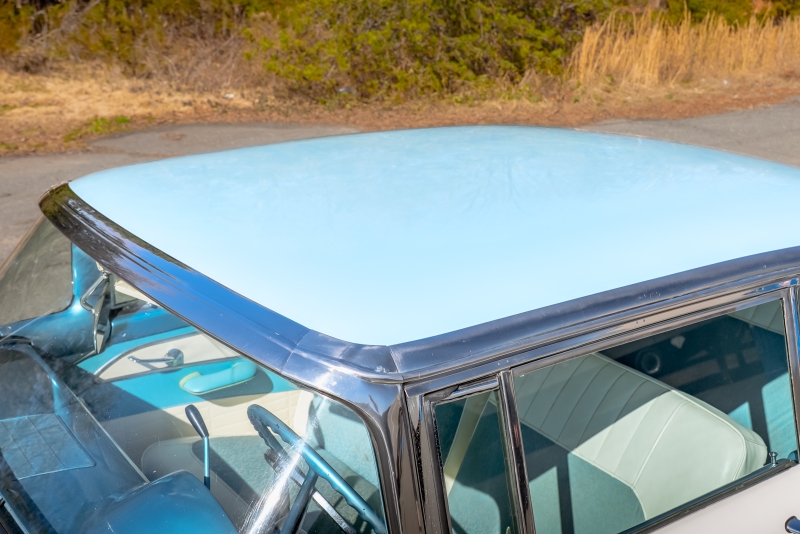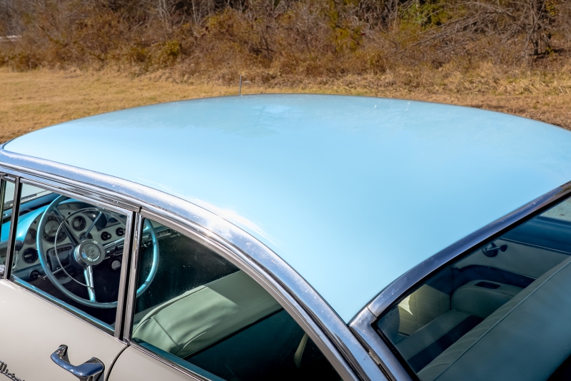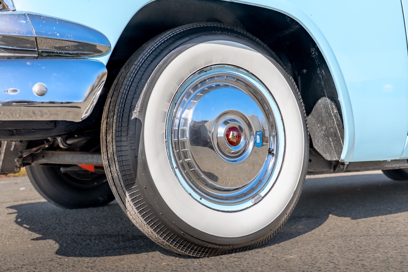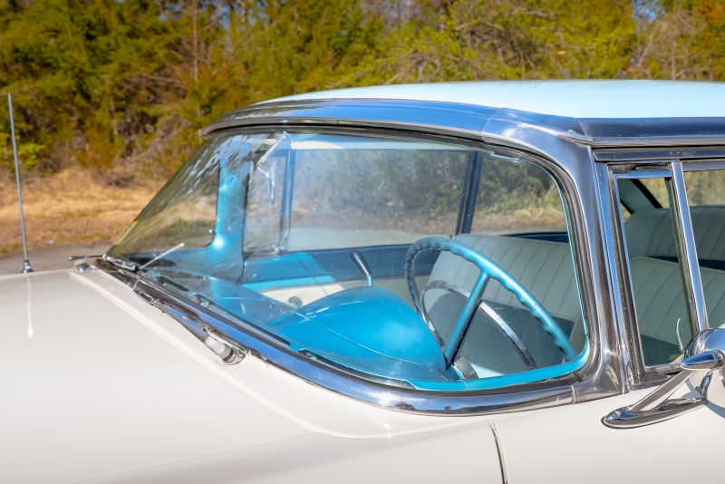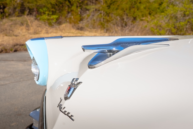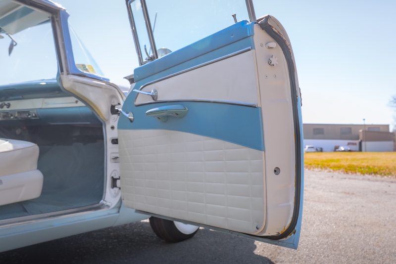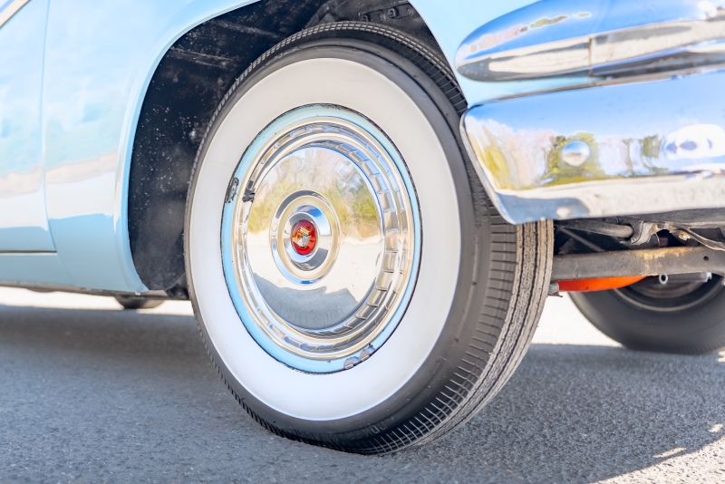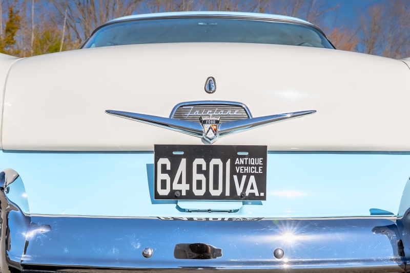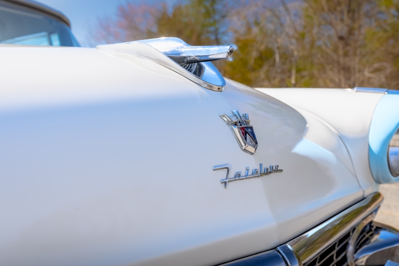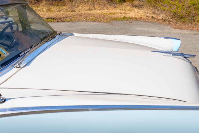 This example is presented in an attractive white over blue two-tone finish, a classic color combination that perfectly complements the car’s elegant lines. The paint is in very good condition, giving the car a bright, well-kept appearance that draws attention wherever it goes. Completing the period look are wide whitewall tires and fender skirts, both signature touches that enhance the Victoria’s unmistakable 1950s character.