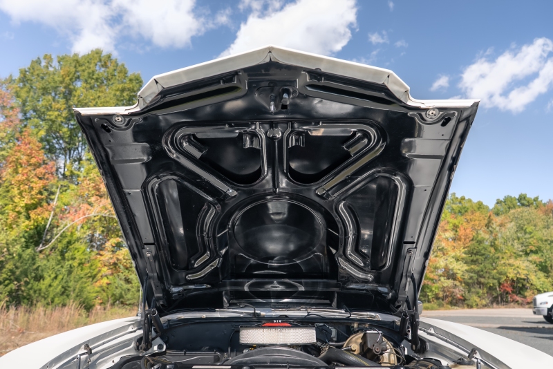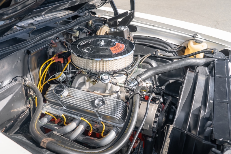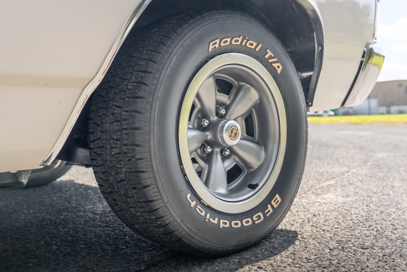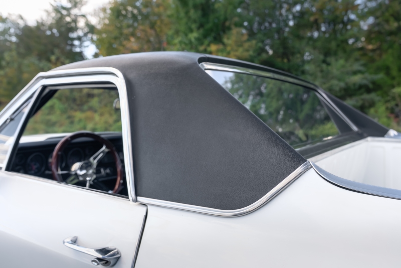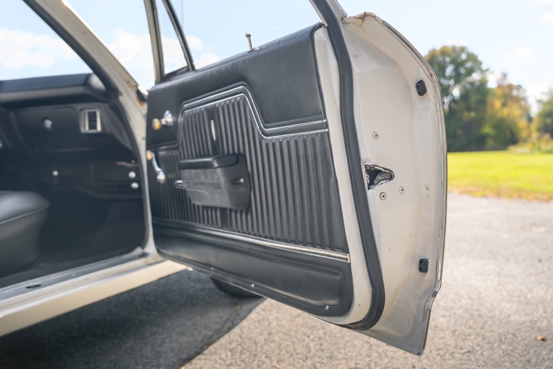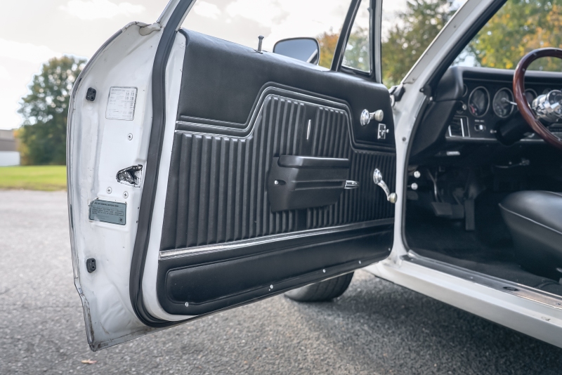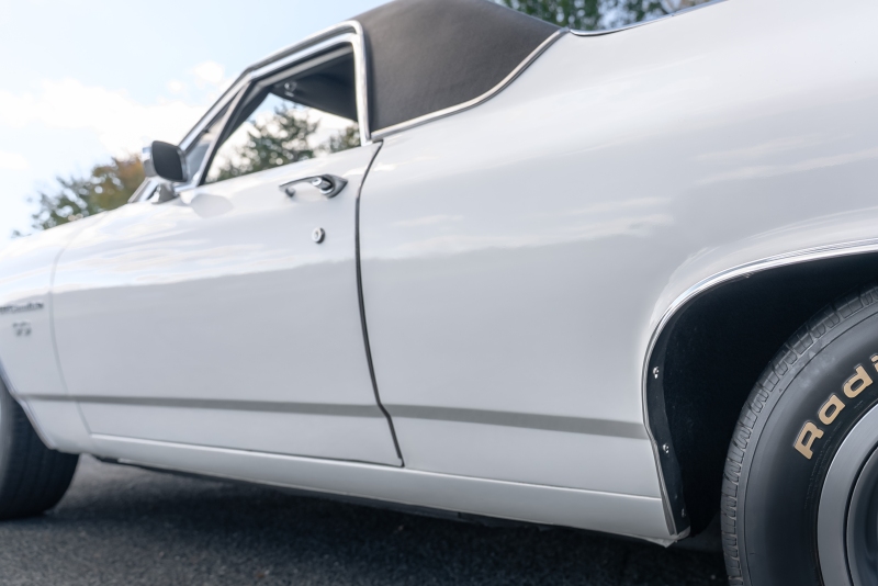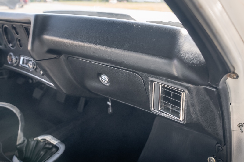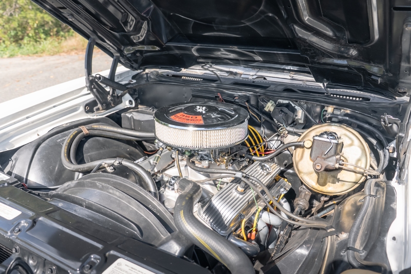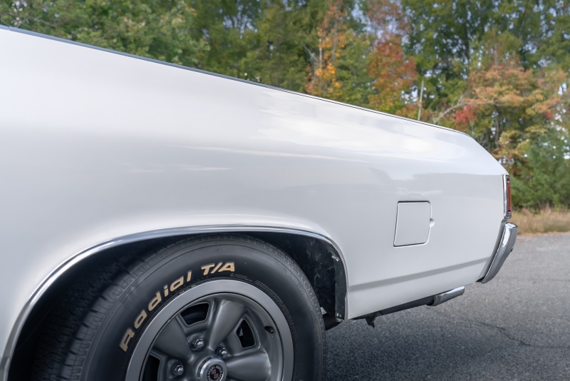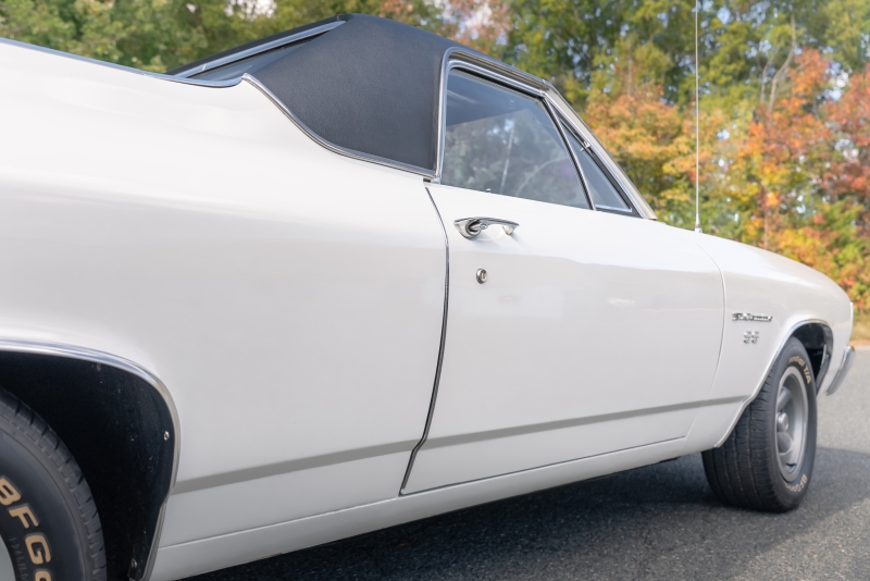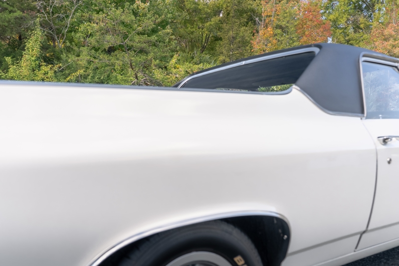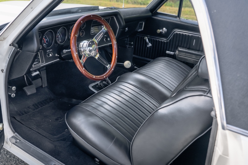 Finished in crisp white with a black vinyl top, this El Camino has a clean, timeless look that highlights its sharp lines and SS heritage. Under the hood, a rebuilt 350 cubic-inch V8 delivers that authentic small-block rumble, paired with a Borg-Warner Super T-10 4 speed floor-mounted manual transmission that replaces the original 3-speed — an upgrade that transforms the driving experience. Every shift feels connected and deliberate, just the way true enthusiasts like it.